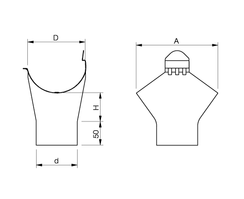 Tapstuk voor aansluiting op een dakgoot van 150mm en een afvoerbuis van 75mm. Dit tapstuk haakt in de krol en wordt achteraan vastgeklemd op de dakgoot. In de dakgoot dient een opening te worden gemaakt die aan beide zijdes minstens 30mm smaller moet zijn dan het tapstuk.